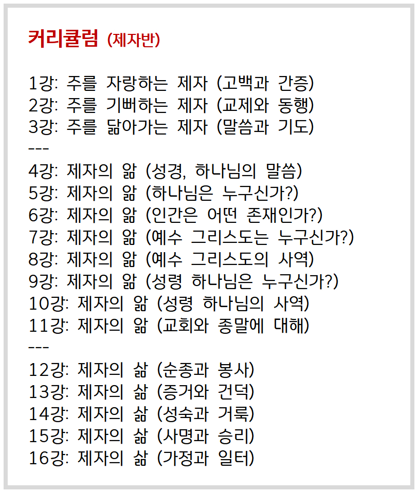 이 과정을 마치게 되면 4단계 필수 과정인 사역반에 참여하실 수 있고, 이후 교회의 실재적 사역에 참여하며, 또 다른 예수 그리스도의 제자를 세우고, 섬기고, 살리는 일에 헌신 합니다.